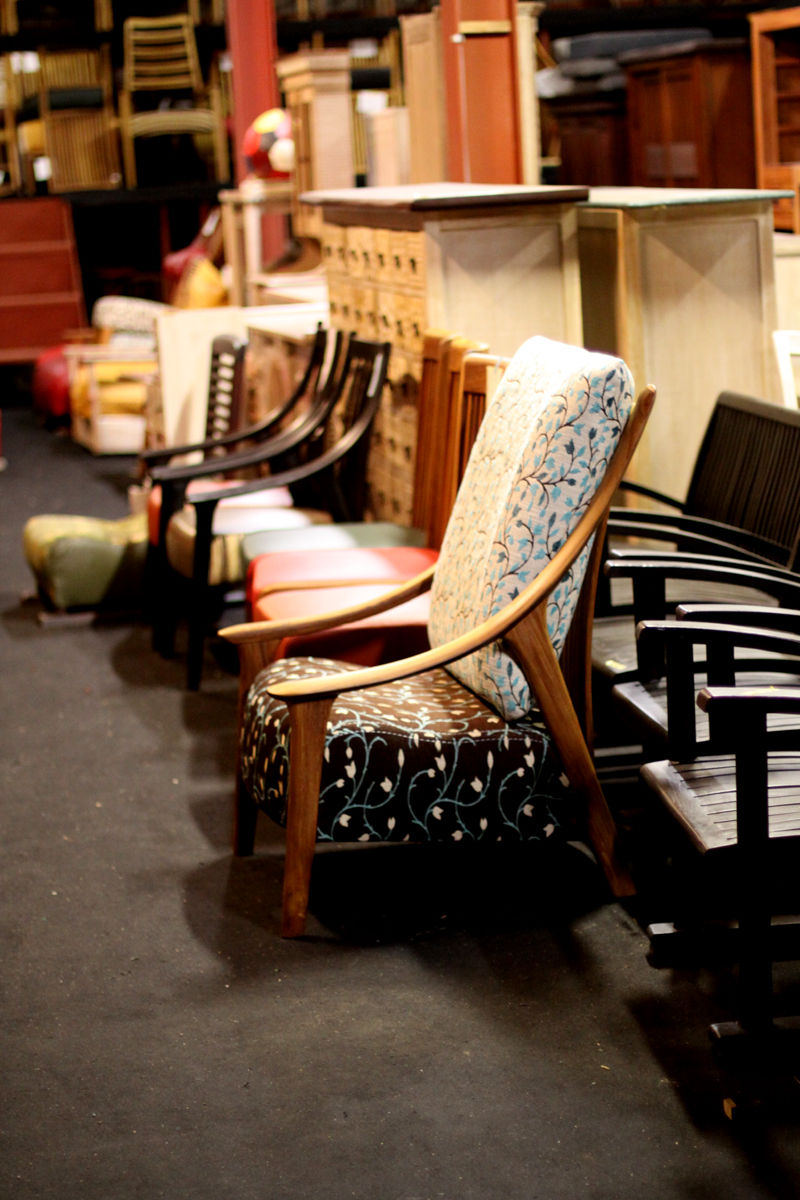 倉庫にある椅子たちの中、