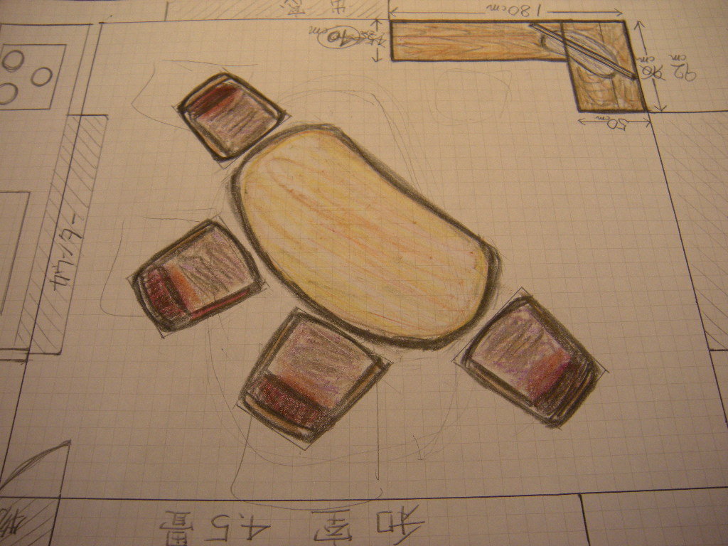 トチのテーブルと、らくらく椅子の配置も考えながらです。